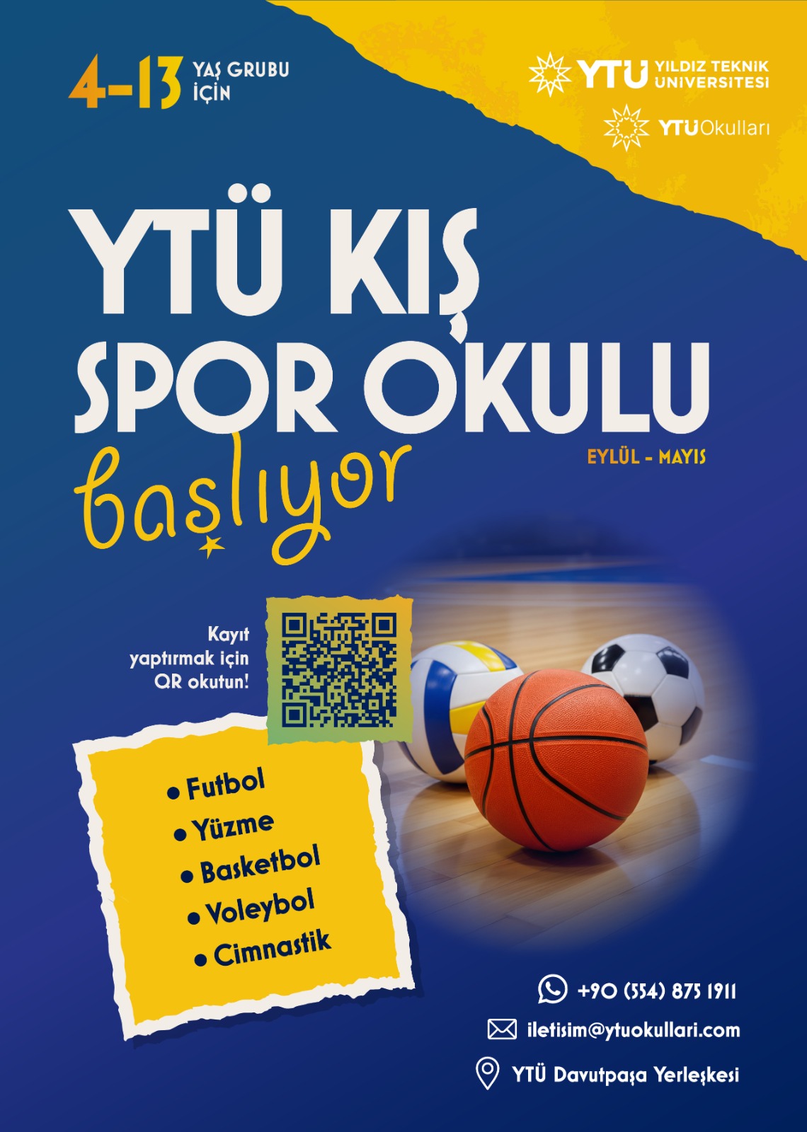 YTÜ Kış Spor Okulu, 4–13 yaş arası çocukların fiziksel gelişimlerini desteklerken aynı zamanda takım ruhu, disiplin ve spor sevgisi kazandırmayı amaçlayan kapsamlı bir hafta sonu spor programıdır. Uzman antrenörler eşliğinde yüzme, futbol, basketbol, voleybol ve cimnastik branşlarında dersler sunulmaktadır. Program, Yıldız Teknik Üniversitesi’nin köklü eğitim geleneği ve güçlü spor altyapısı ile çocuklara güvenli ve nitelikli bir öğrenme ortamı sağlar.