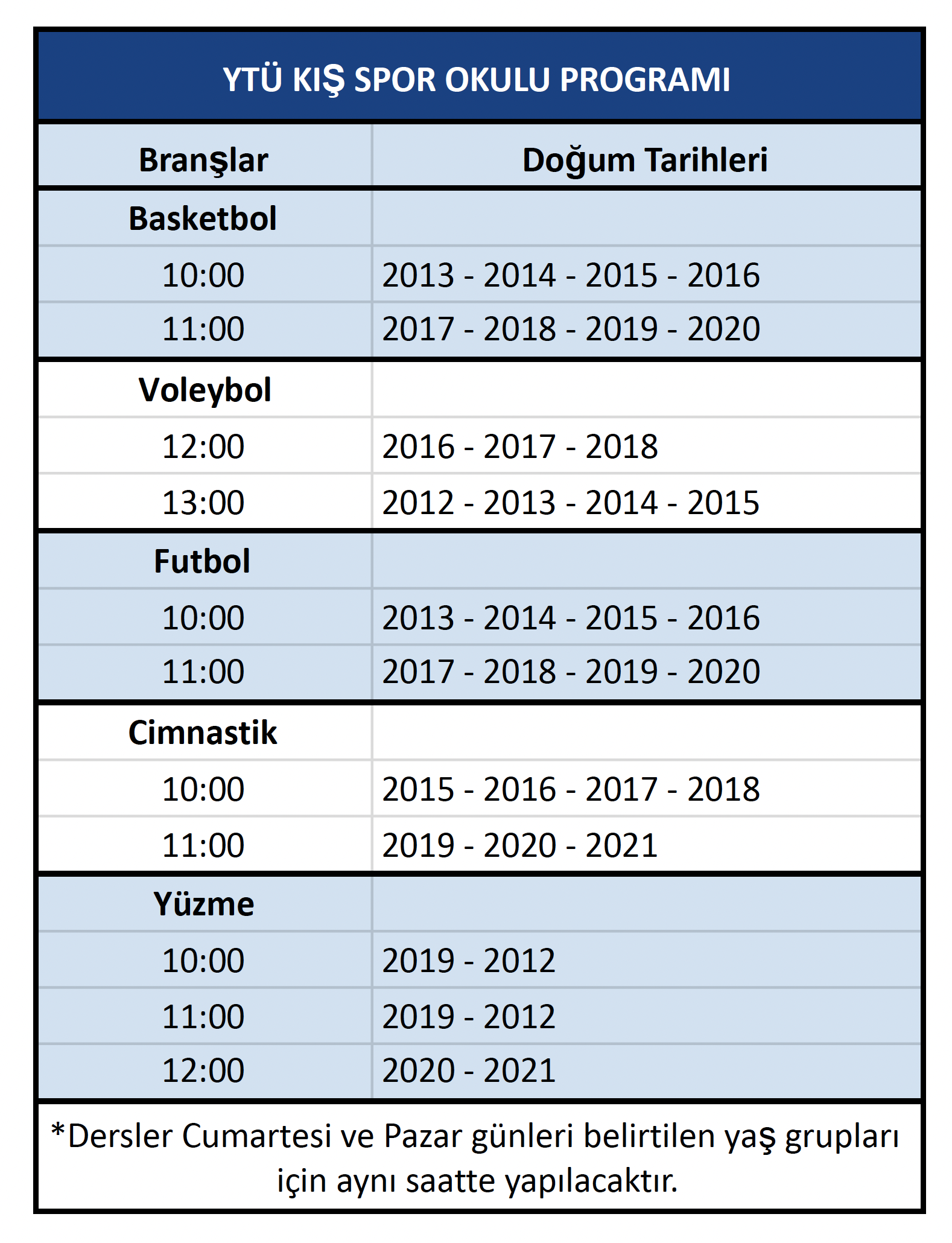 • Doğum Tarihi ve YTÜ Kış Spor Okulu Programına göre branş alımlarını yapılmalıdır.